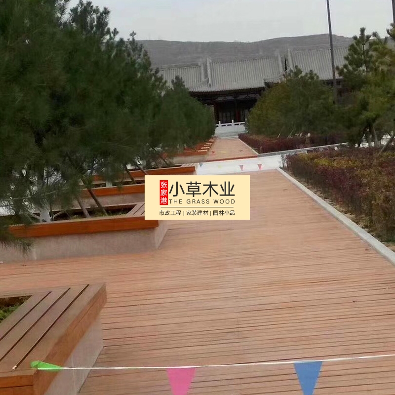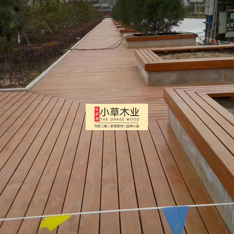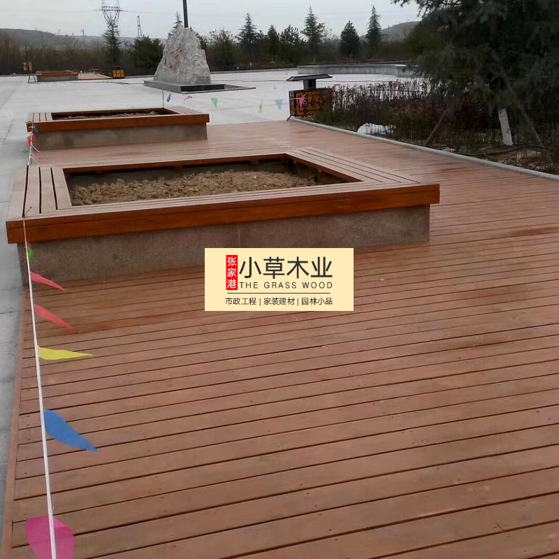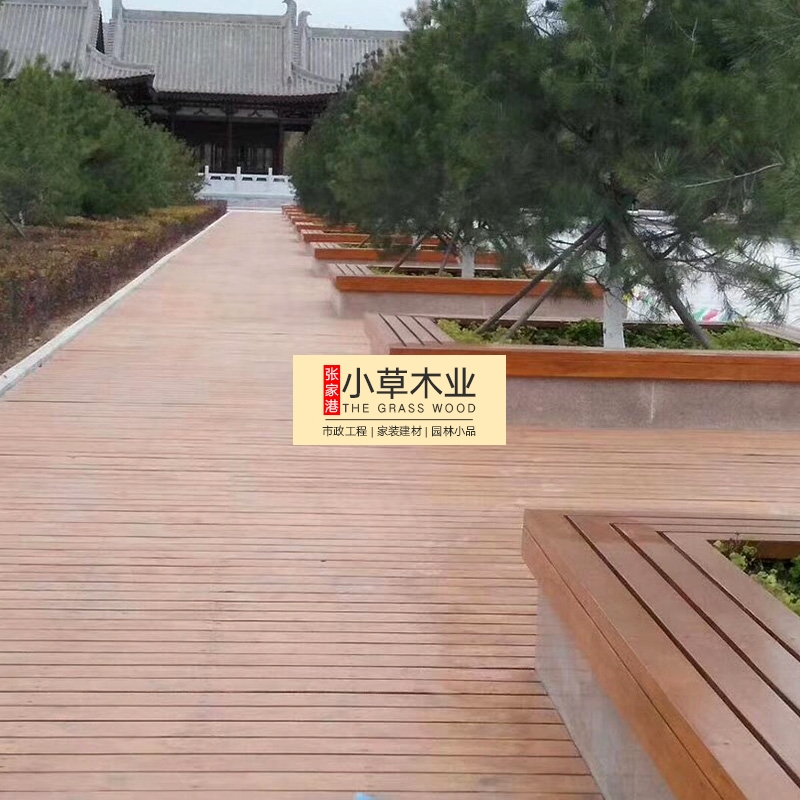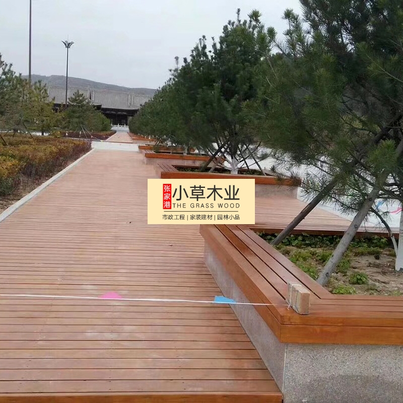 此项目采用的材料为:南美菠萝格防腐木,表面刷栗色漆,使材料色差变小。