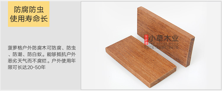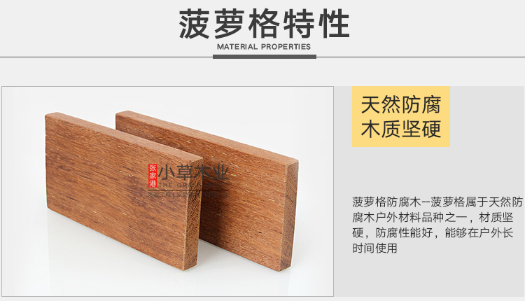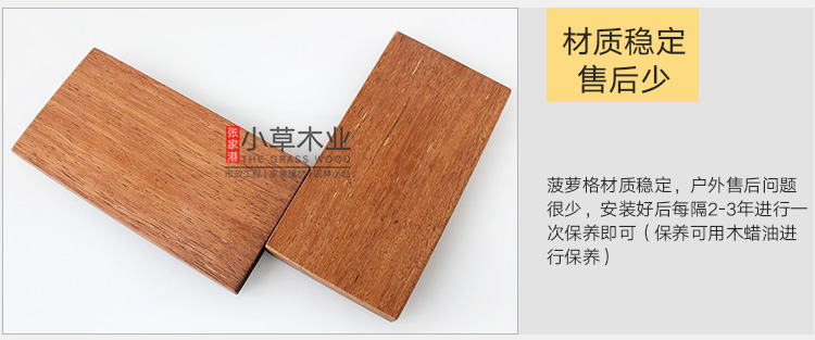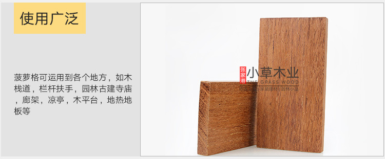 菠萝格材质:木材重或中至重,气干密度0.80-0.94 g/cm3,纹理交错,重硬坚韧,材性其稳定,花纹美观,心材甚耐久,有“红木”之称,含油、抗潮抗白蚁性,耐候性强。