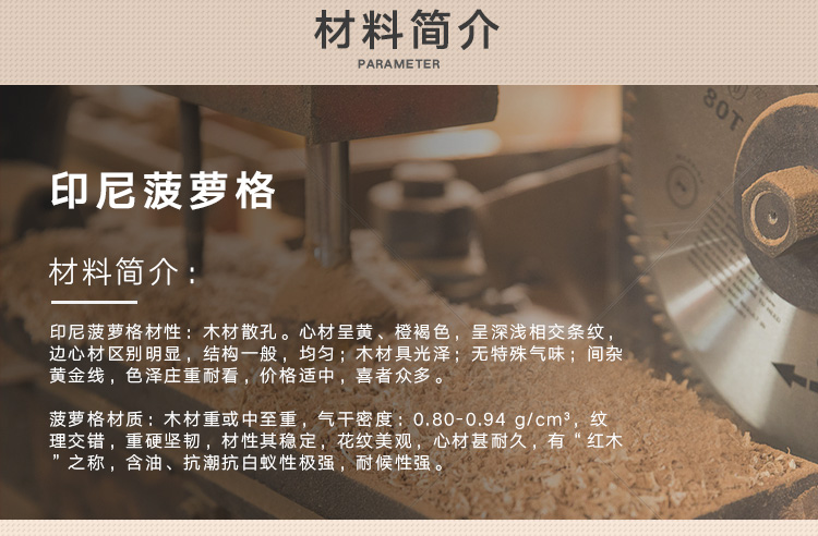 菠萝格材性:木材散孔。心材呈黄、橙褐色,呈深浅相交条纹,边心材区别明显,结构一般,均匀;木材具光泽;无特殊气味;间杂黄金线,色泽庄重耐看,价格适中,喜者众多。
