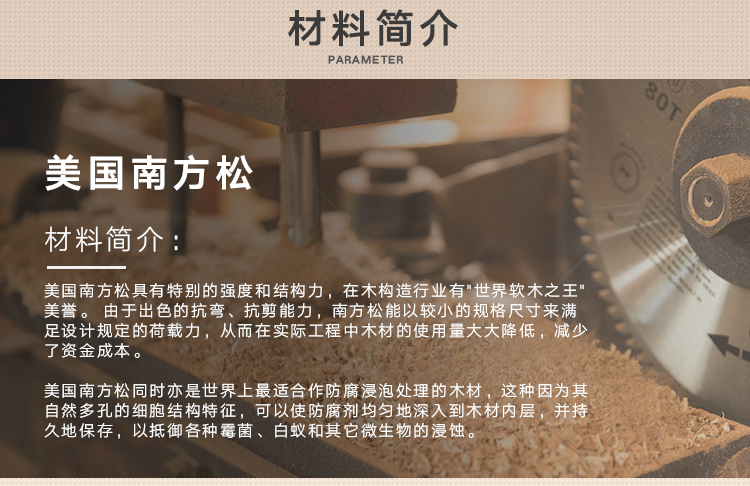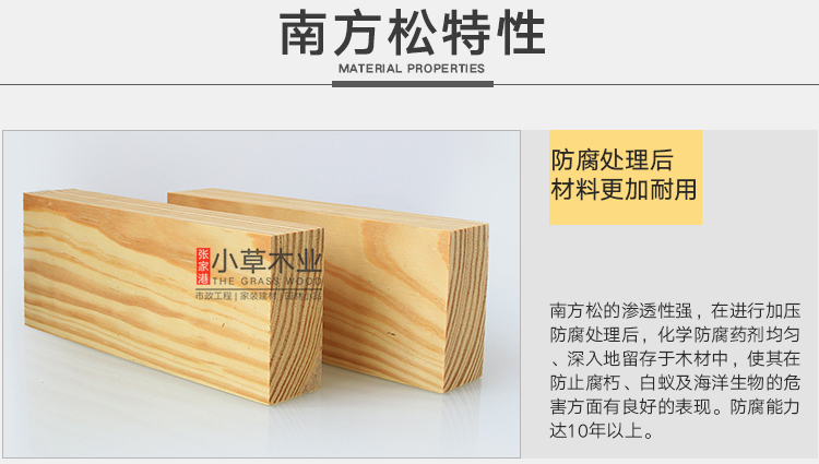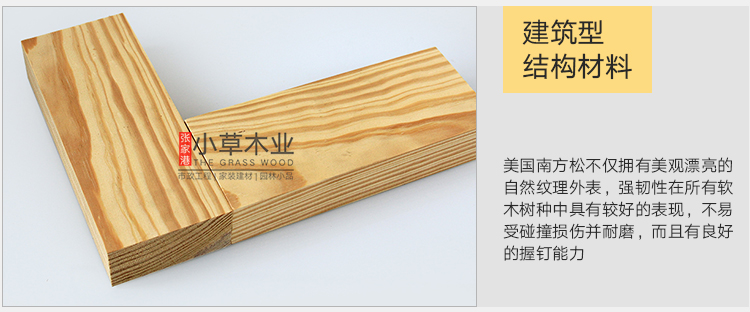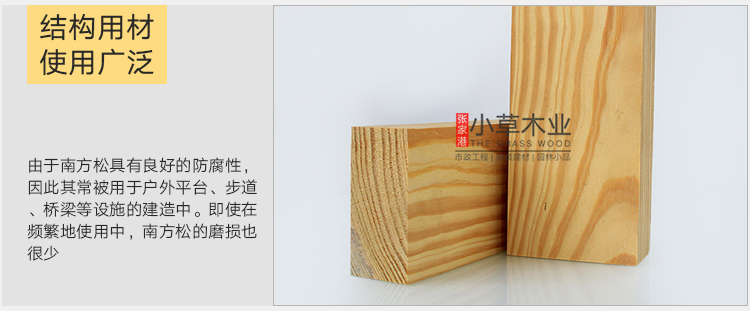 南方松海湾油松及长叶松强度较高,其他两种稍低。耐腐性中等,但防腐处理不易。干燥慢,干缩略大,加工较难,握钉力及胶粘性能好。