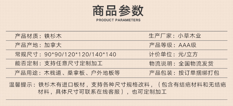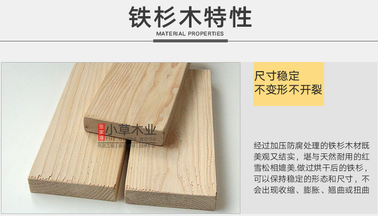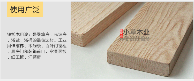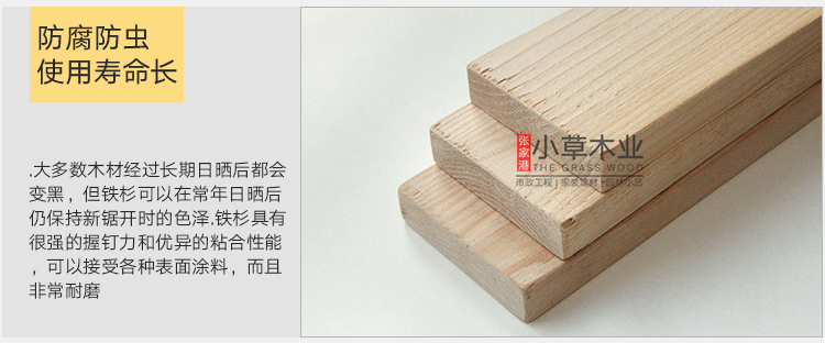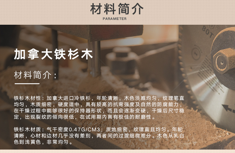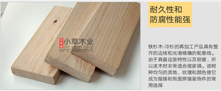 铁杉木材性:加拿大进口冷铁杉,年轮清晰,木色淡雅均匀,纹理笔直均匀,木质细密,硬度适中,具有较高的抗弯强度及自然的防腐能力,在干燥过程中能够很好的保持器形状,而且会逐渐变硬,干燥后尺寸稳定,出现裂纹的倾向很低,在试用期内具有极佳的耐磨性。