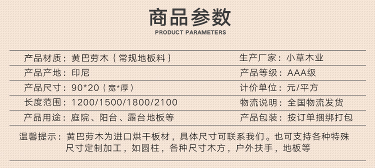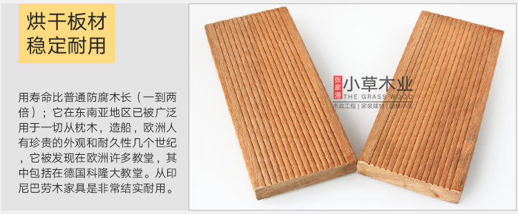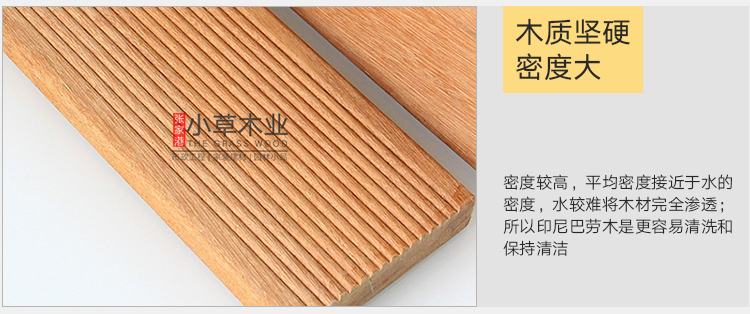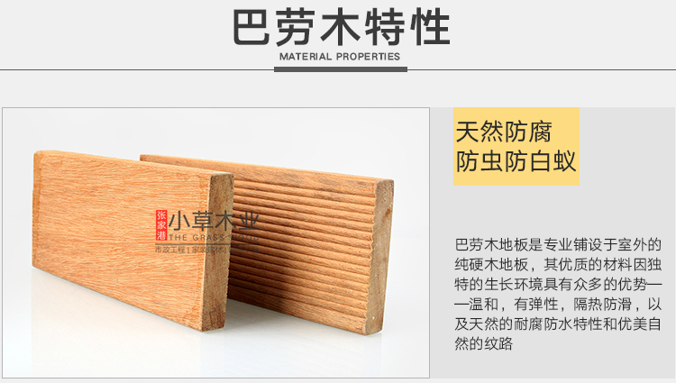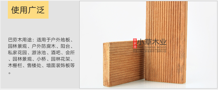 巴劳木材性:耐久等级:1-2级,属阔叶林材;耐磨性好;开裂少;抗劈裂;原木无需化学处理即可长期使用在户外。